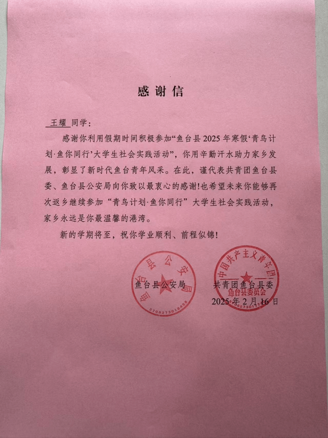 必赢集团bwin“返家乡”社会实践表扬信+4