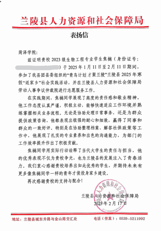2023级生物工程1班焦樾同学在兰陵县人社局劳动人事争议仲裁院进行志愿服务工作期间,协助处理日常事务、整理档案、为群众提供政策咨询等工作,表现出色。不仅感受到了法律威严和人文关怀,还从中深受启发。