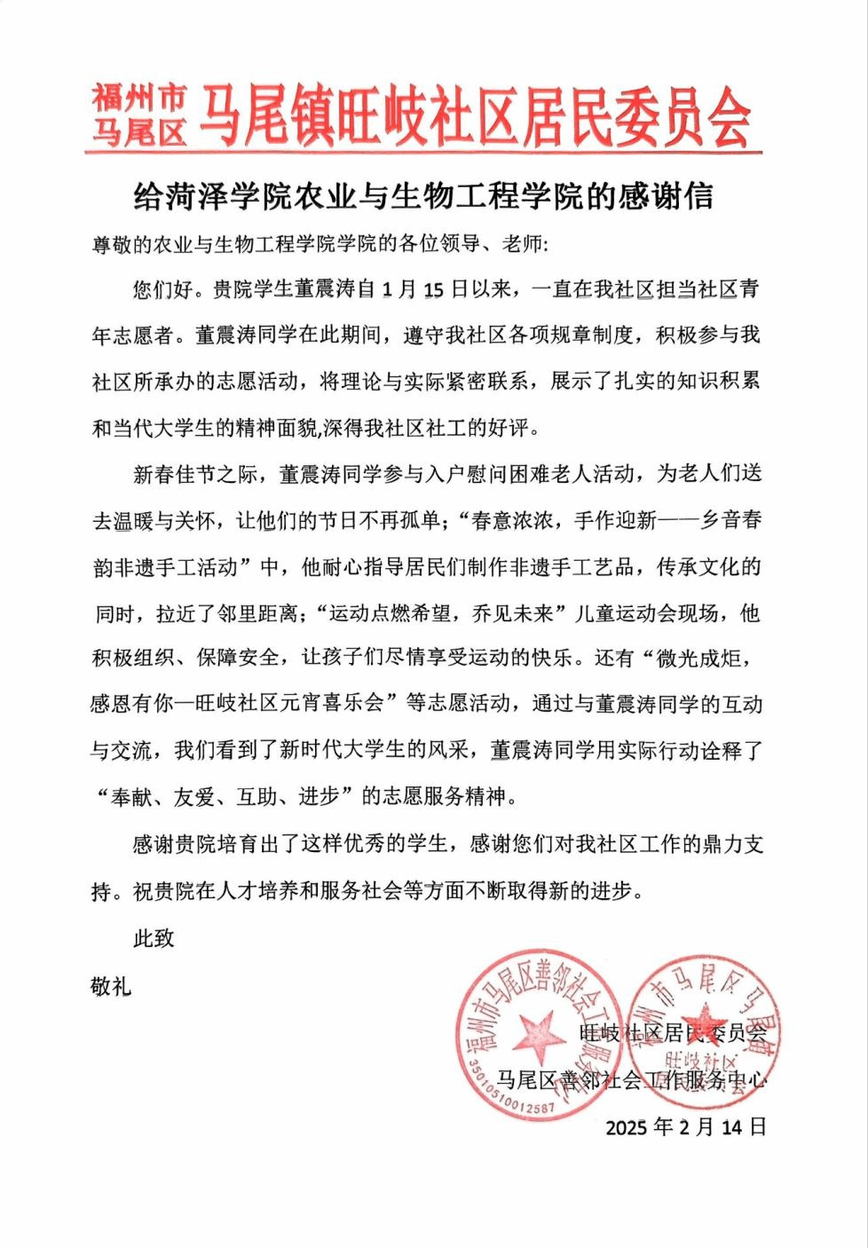 2024级园艺2班董震涛同学在福州市马尾区马尾镇旺岐社区居委会实习期间,积极参与社区开展的入户慰问困难老人活动、制作非遗手工艺品、儿童运动会等多项活动,展现了大学生的风采,用实际行动诠释了“奉献、友爱、互助、进步”的志愿服务精神。