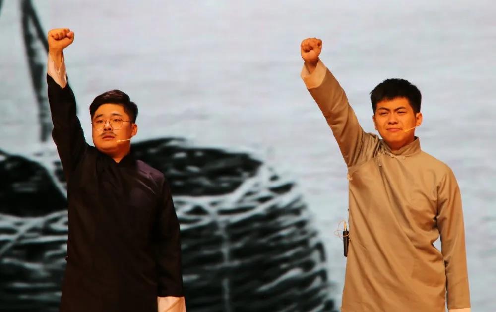 “为了中华民富国强!”“为了民族再造复兴!”“我愿意奋斗终生!”李大钊和陈独秀的壮烈宣誓是革命先烈的初心,是爱国人士的一腔热忱,引无数观众潸然泪下,带给观众巨大的心灵震撼,演出现场掌声不断。晚9:00,主演人员共唱《国际歌》,在他们动情的歌声中,此次话剧演出正式落下帷幕。