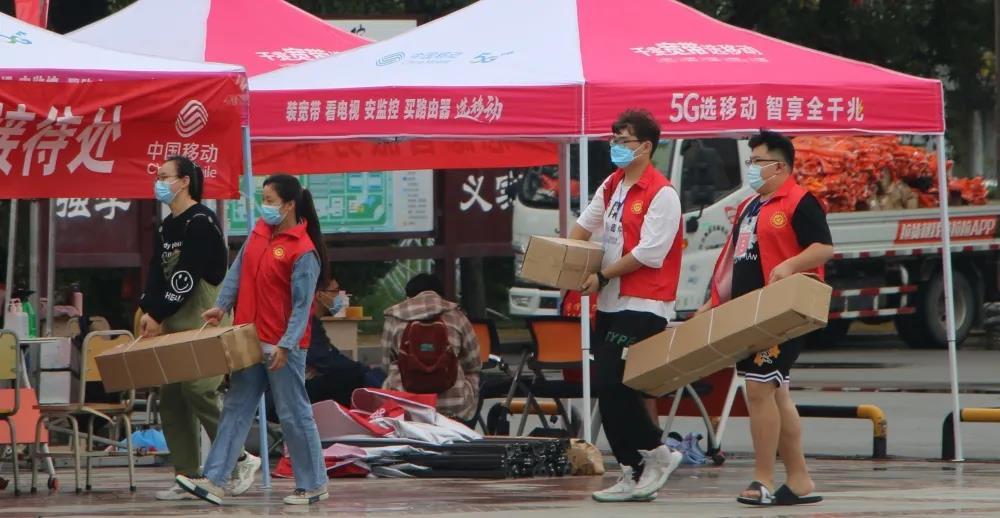 他们冒雨为新生搬运行李