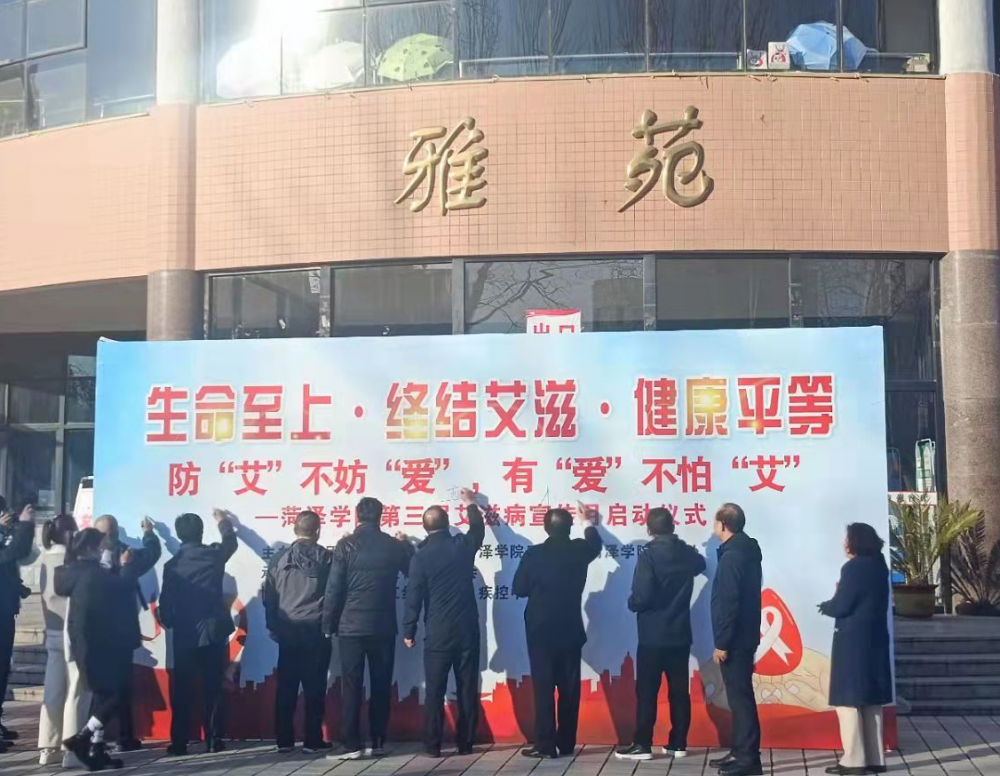 值第34个世界艾滋病日之日,12月1日下午,由菏泽市卫生健康委员会、菏泽市疾病预防控制中心主办,学校学生工作处、后勤管理处、团委联合承办的必赢集团bwin第三届预防艾滋病宣传月启动仪式在雅苑餐厅前广场举行。菏泽市卫健委副主任、民革菏泽市委主委赵胜利,菏泽市疾病预防控制中心副主任王均勇,菏泽市传染病医院副院长张玉福,菏泽市疾病预防控制中心皮肤病防治科主任霍炜,牡丹区疾病预防控制中心艾滋病防治所所长孔祥利,必赢集团bwin后勤管理处处长杨依华、团委书记赵晓龙、学生工作处副处长姜保周和张华光等同志,以及300余名学生代表出席了仪式。