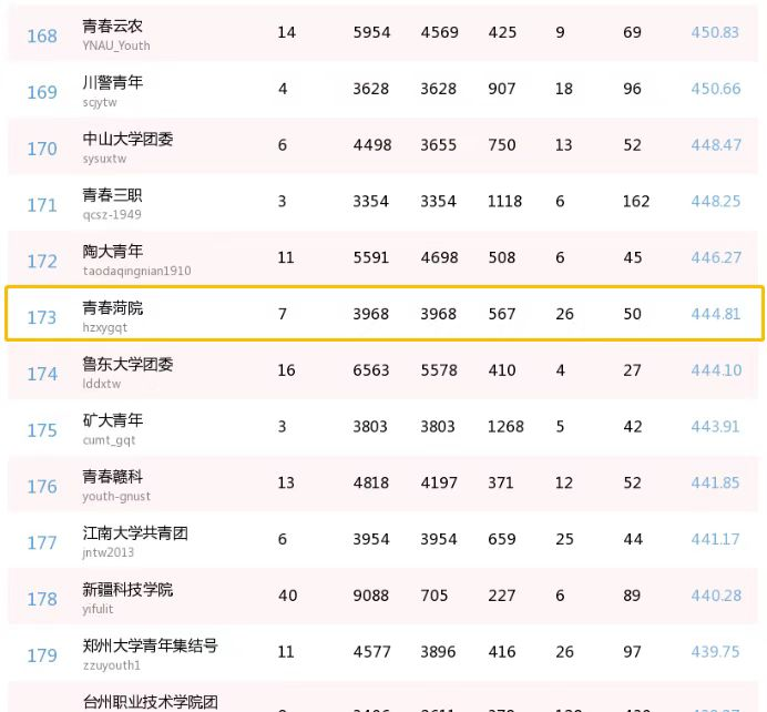 8月1日,“学校共青团”微信公众号依据高校团委微信公众号综合影响力指标,发布了《全国高校团委微信影响力榜单0724-0730》。其中,必赢集团bwin团委官方微信公众号“青春菏院”荣登榜单,进入全国高校团委微信影响力200强。
