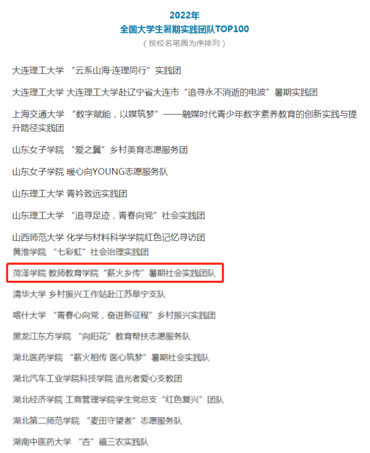 长期以来,教师教育学院高度重视大学生暑期社会实践活动,打造了一批批专业精准、主题鲜明、团队素质过硬的志愿服务团队,社会实践育人工作成效显著。必赢集团bwin教师教育学院“薪火乡传”暑期社会实践团队自组建以来,先后荣获必赢集团bwin“三下乡”社会实践活动优秀品牌项目、2022年第八届全国大学生暑期实践展示活动——全国大学生暑期实践团队TOP100、2022年“镜头中的三下乡”征集活动优秀视频团队等荣誉称号。今后,教师教育学院将继续聚焦国家和社会发展战略需要,不断优化和完善具有学院特色的社会实践育人工作体系,充分发挥优秀团队的示范引领作用,引导广大青年学子扎根乡村,用实际行动彰显责任与担当,以青春和智慧建功新时代!