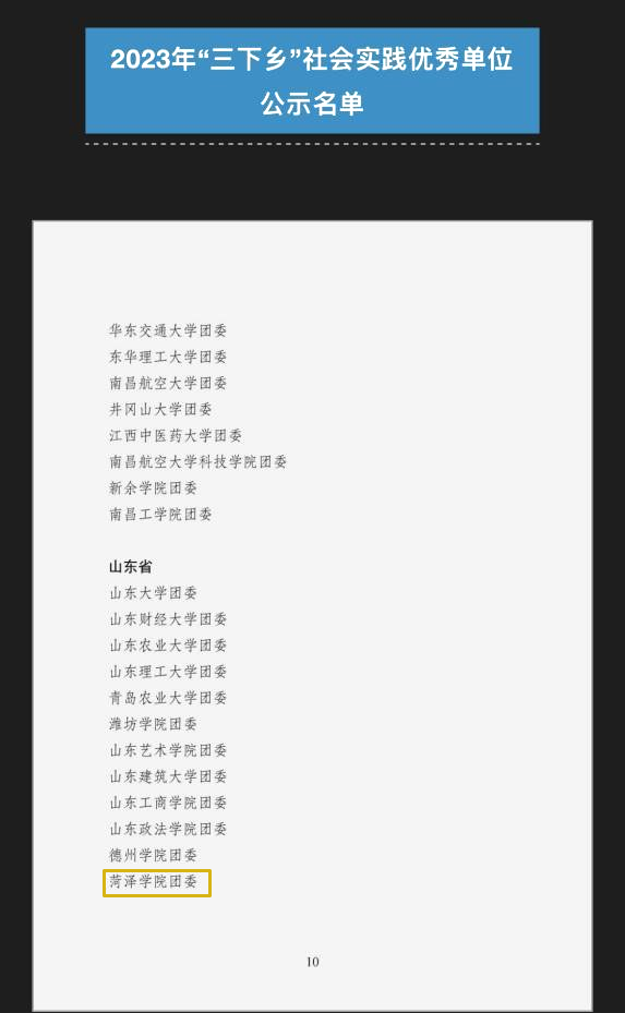 必赢集团bwin2023年暑期社会实践以“学习二十大 永远跟党走 奋进新征程”为主题,共组织理论普及宣讲、党史学习教育、乡村振兴促进、发展成就观察、民族团结实践五大专题,推普助力乡村振兴、“小荷学堂”、创城志愿服务、“青鸟计划·返家乡”岗位实习等多个专项,科学布局、全面覆盖,引领菏院学子在社会实践中受教育、长才干、作贡献。来自全校17个学院的400余支实践团队、近万名青年学子通过“线上+线下”、“集中+分散”的形式奔走在乡村振兴示范片区、社区、农村、企业等,广泛开展实践活动,用脚步丈量祖国大地,用行动回应时代召唤。其中,有2支团队入选2023年暑期社会实践全国重点团队、5支团队入选2023年全国千支大学生志愿宣讲团、1支团队分别入选全国大学生百强实践团队和“镜头中的三下乡”优秀视频团队、1支团队入选全国“推普助力乡村振兴”专项社会实践团队、5支团队入选省级重点团队。
