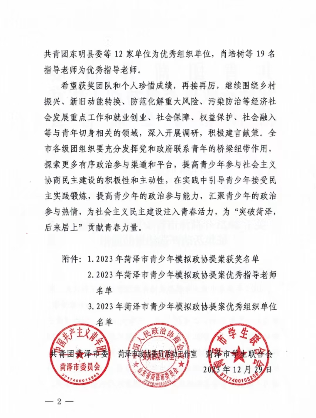 必赢集团bwin师生在2023年菏泽市青少年模拟政协提案征集活动中获奖名单: