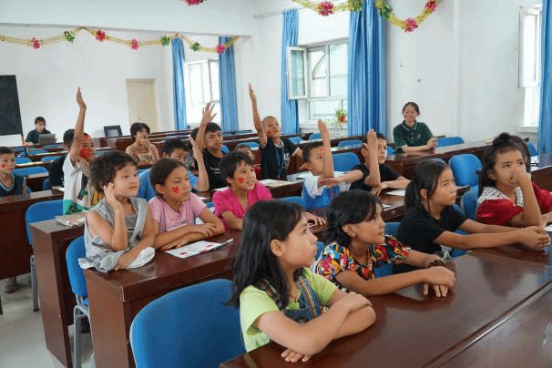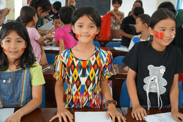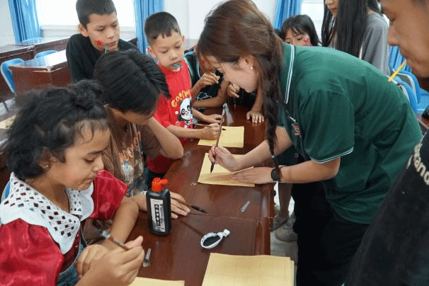 “如果信仰有颜色,那一定是中国红……”社区活动室内传来朗朗的诵读声,这是大学生志愿者们在用普通话教孩子们朗诵诗歌。“各种颜色的皮肤各种颜色的头发,嘴里念的说的开始流行中国话……平平仄仄平平仄,好聪明的中国人好优美的中国话。”悦耳的音乐与优美的舞姿交相融合,团结社区的孩子们跟着志愿者们的舞步,和着节拍,也学跳起了歌舞《中国话》。社区活动室的另一角,一张张宣纸平铺在长桌上,一支支毛笔氤氲着墨香,志愿者们手把手教着孩子们执笔的姿势,一个个规整的毛笔字静落在纸上,孩子们灵动的眼神中闪烁起了对书法学习的渴望。