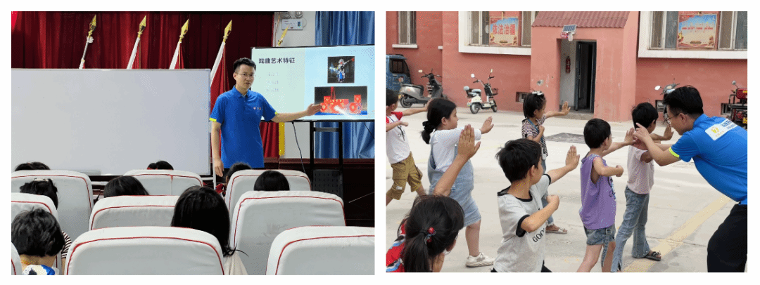 立足菏泽,放眼华夏。毕业于中国戏曲学院的支教指导老师钱鹏带领小朋友们共同领略了戏曲之美,通过讲述中国戏曲发展的历史,涵盖剧种、行当、“四工”、“五法”等一系列全方位的戏曲知识科普,让小朋友们不仅知道中国戏曲之美,更知道中国戏曲美在何处。此外,志愿者们还给小朋友们细致、生动的讲解诸如中国传统二十四节气、神话传说、历史故事等优秀传统文化,让青少年深刻感受到中华文明蕴含的悠久历史与内涵。课下,志愿者们还带领小朋友做中医养生八段锦健身气功,达到矫正体态,柔筋健骨、强身健体的作用。