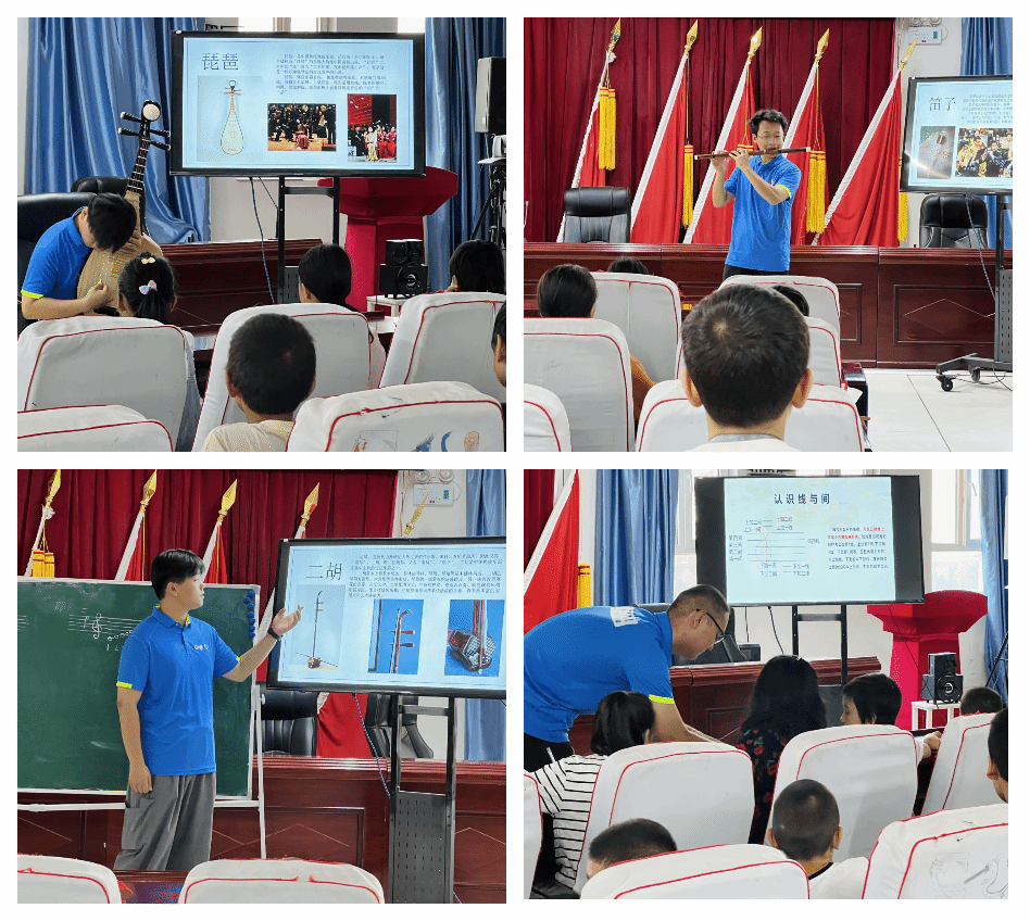 音乐课由音乐与舞蹈学院音乐学、民族器乐、音乐演唱专业的学生担任主讲老师。他们结合当地文化特色,运用生动有趣的教学方法,设计具有地方特色的教学内容,激发学生的学习兴趣和创造力。在民族器乐课上,志愿者们向新疆少年儿童现场展示了中国传统乐器——笛子和琵琶,并进行现场演奏,切实促进文化交流互鉴。此外,志愿者们还带领孩子们认识口风琴和钢琴两种乐器,增进对西方音乐的了解。在科普的同时,志愿者们还带领孩子们学习乐理知识。通过带领孩子们学习基本音符、节奏、音阶等知识,更深入地理解音乐结构,激发对音乐的兴趣与热爱,为未来的音乐学习及综合素养打下坚实基础。