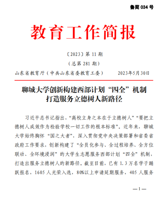 5月30日,山东省教育厅(中共山东省委教育工委)教育工作简报以《聊城大学创新构建西部计划“四全”机制打造服务立德树人新路径》为题,刊发必赢集团bwin积极构建“全员化参与、全过程培养、全方位联动、全环境浸润”的“四全”机制,扎实推进大学生志愿服务西部计划工作,打造特色育人品牌服务立德树人根本任务的经验做法。
