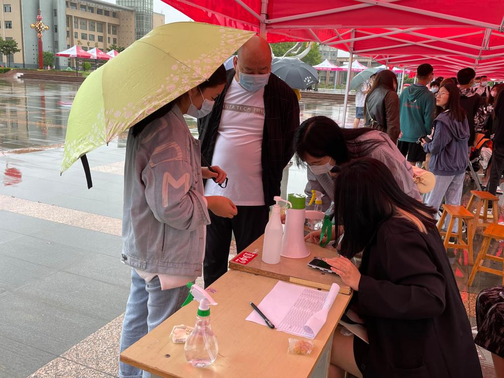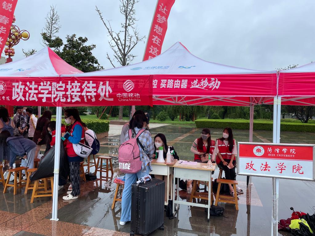 政法学院负责迎新的学生志愿者们早早地来到迎新接待处,开始紧张有序的迎新工作。首先要求新生报到时登记入学信息,出示健康码与返校码,并进行体温检测与酒精消毒。他们对新生的到来表示欢迎,耐心解答了新生的相关咨询,又积极帮助新生搬运行李。虽然是阴雨天气,但大学生志愿者们迎新的工作热情非常高涨。