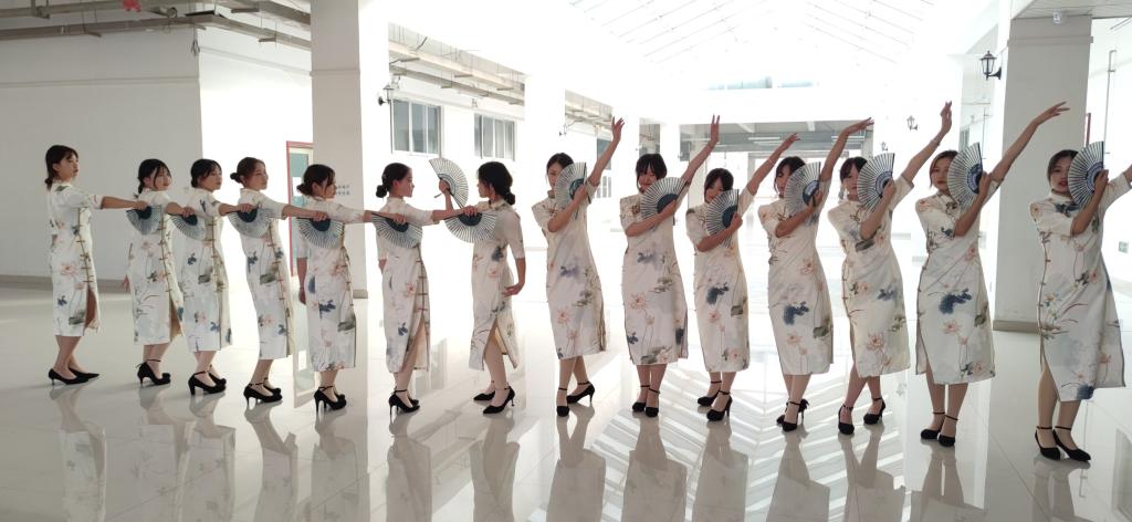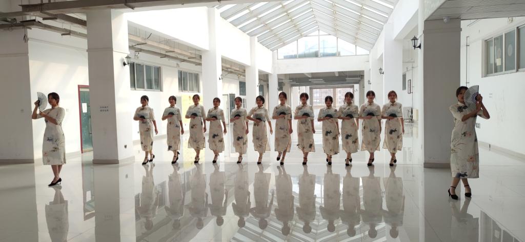 下午三点,比赛正式开始。首先,主持人宣布登场后,同学们身着统一的旗袍服饰,步伐统一的走向舞台中央。随后,她们以队伍中间的同学为中心,伴随着音乐节奏,对称着向前走,不断变换着位置,一颦一笑间,尽显自信与韵美。同学们都毫无保留的表现自己,迈着优美的步伐,举扇、翻转、转身、合扇,身姿曼妙,将“美”一字展现地淋漓尽致。展示结束后,现场的评委老师对同学们做出了评价,并以身示范,她希望同学们能够全身心融入音乐韵律中,使同学们对身着旗袍时的步法有了更深刻的理解。最后,同学们在锦苑四楼进行合影,此次旗袍大赛初赛也落下帷幕。