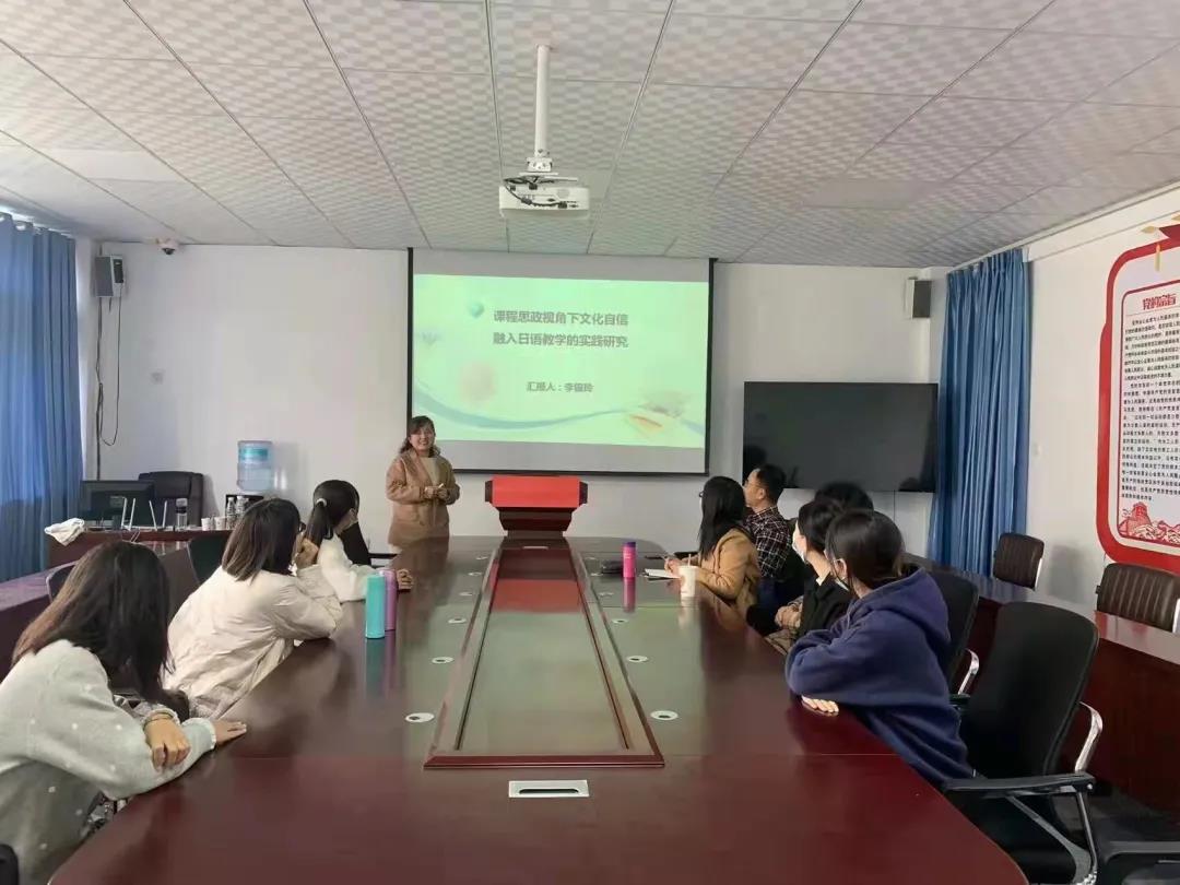 2021年11月4日下午1点,外国语学院在212沙龙室举办了“青蓝沙龙”第六讲。本次讲座由楚焕焕老师主持,主讲人为我院日语教师李银玲,主题为“课程思政视角下文化自信融入日语教学的实践研究”,外国语学院多名教师聆听了该报告。
