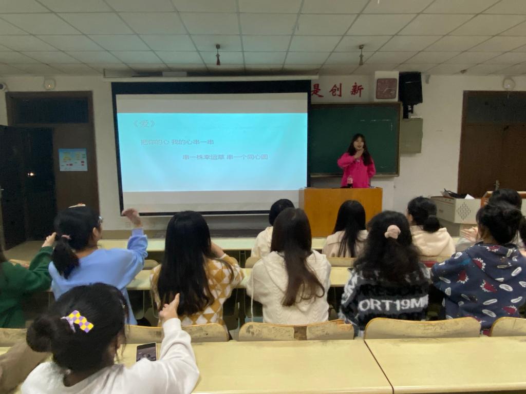 本次教学内容以歌曲《爱》为基础,将歌词译为手语,随着歌曲的播放,参与活动的成员也随之打出相应手语。首先,活动负责人王梓楠播放歌曲MV,让同学们对手语有了初步的认识和了解。随后,王梓楠从单个字词的手势入手,由简到难,在经过两遍的教学后,同学们便很快地掌握了整句歌词的手语。最后,同学们随着歌曲的旋律舞动双手,做出各种动作,传递了歌曲的情感和意境。教学过程中,同学们认真学习,积极询问,整个活动都处在一个融洽、友好、诚挚的氛围中。