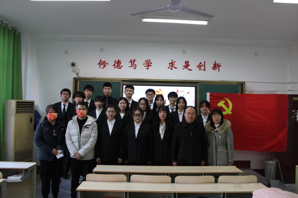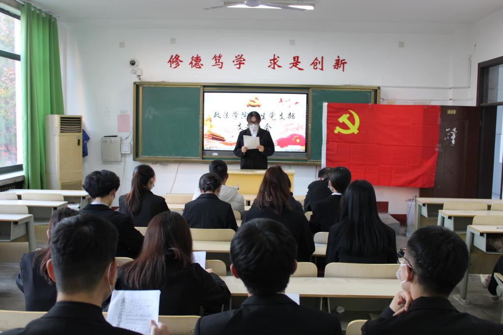 2021年11月8日,政法学院学生党支部于文科楼211室召开接收预备党员的党员大会,会议由学生党支部书记宋艳副教授主持,纪检委员欧安欣教授,组织委员李晓燕讲师,辅导员王胜军参加。本次会议的主要任务是讨论接收发展对象孔俊凯等16名同学为中共预备党员。