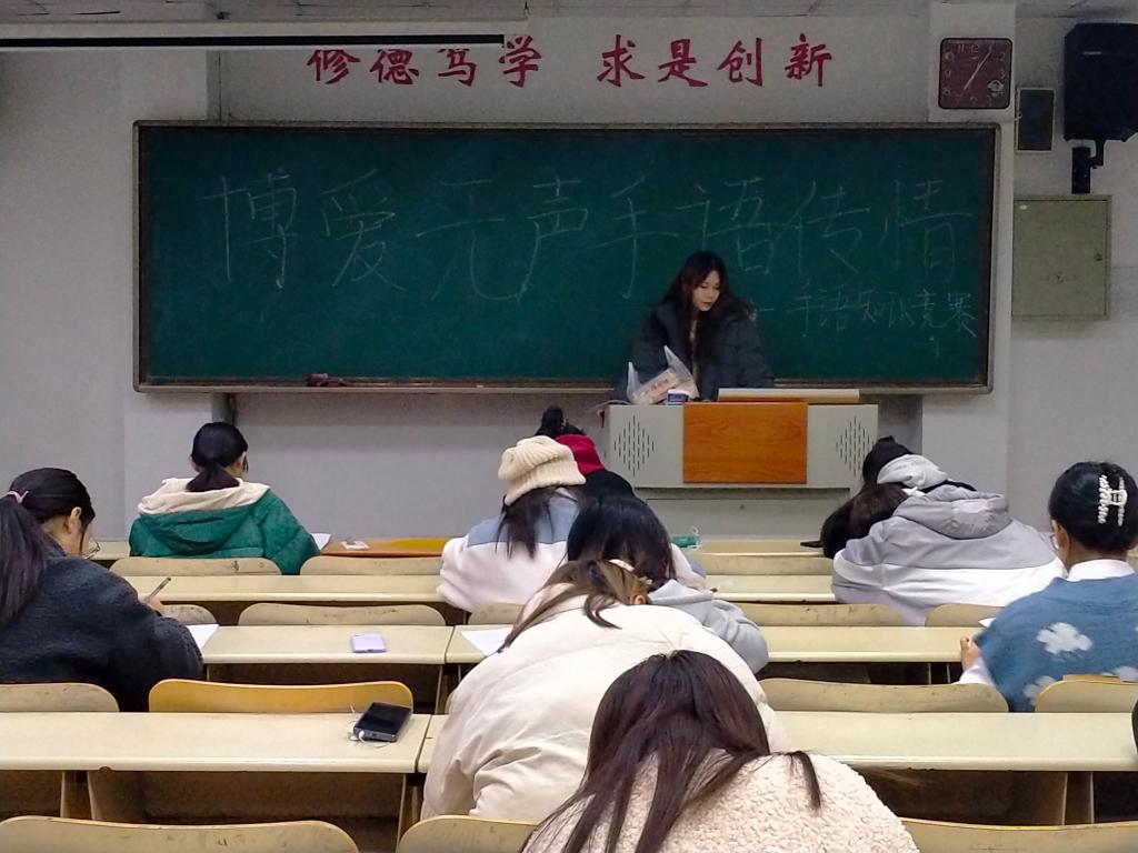 11月16日晚,由教师教育学院爱无声手语社举办“博爱无声,手语传情”主题手语知识竞赛在8号教学楼512室举行,我院90人参加本次竞赛。