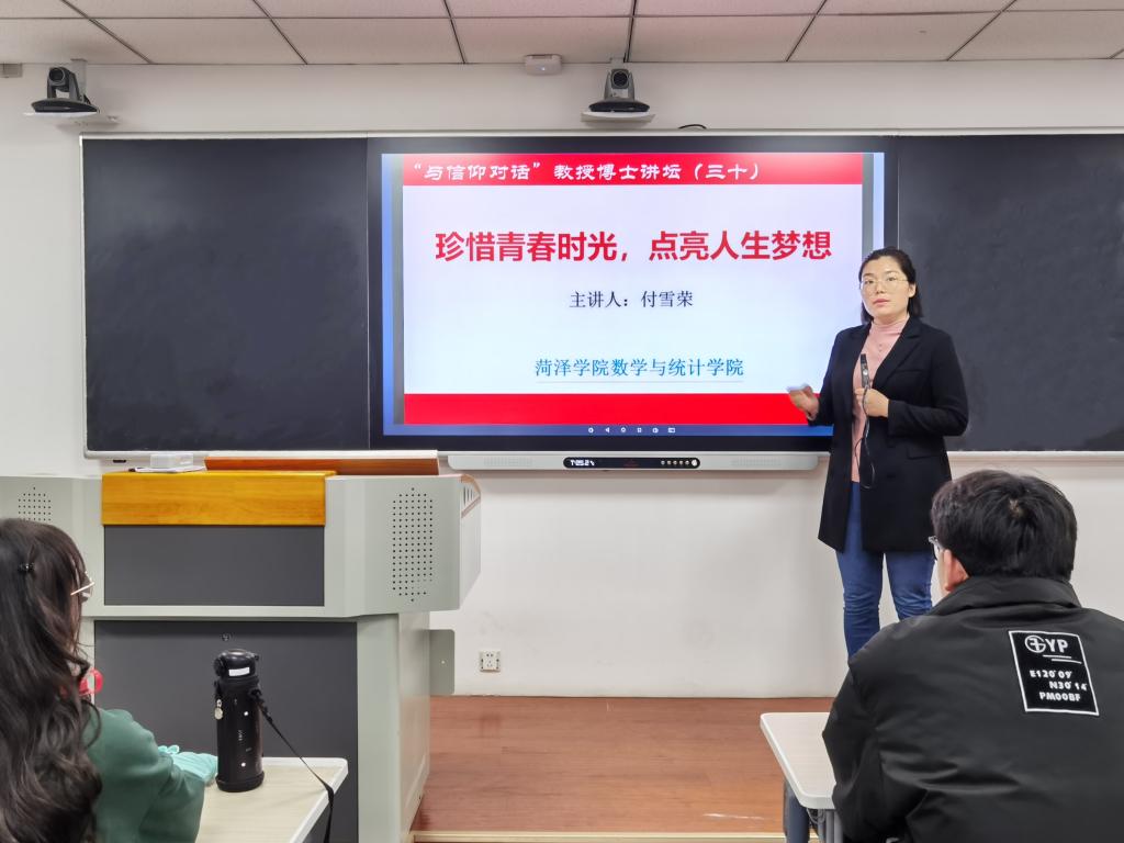 11月22日晚,付雪荣博士应邀做客数学与统计学院第三十期“与信仰对话”讲坛,在6号教学楼210室作题为“珍惜青春时光点亮人生梦想”的报告。报告会由学工办主任吕锦茹主持,2019级学生到场聆听。