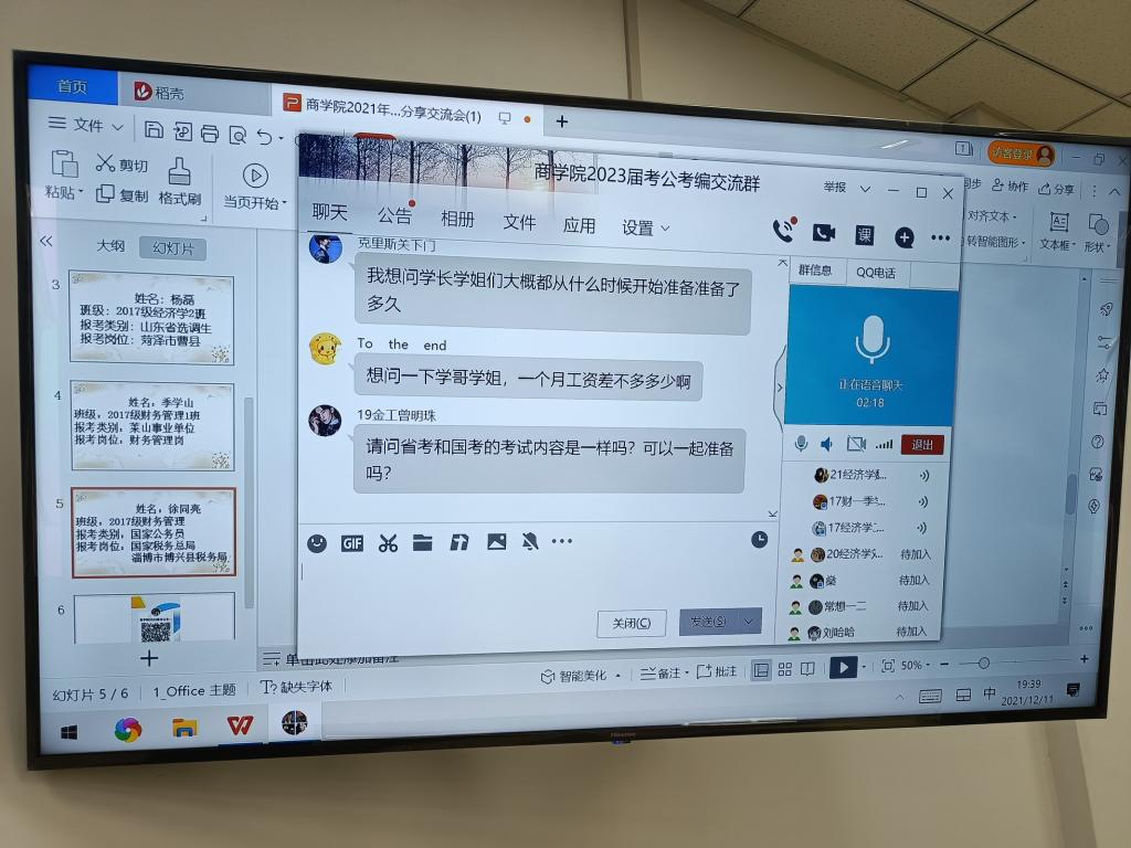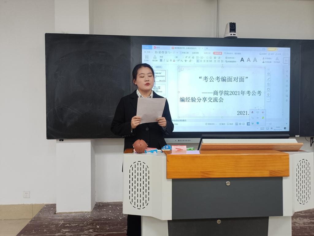 为推进学生树立正确的求职方向,将个人理想追求融入党和国家事业之中,帮助学生更加深入、全面的了解公务员考试,激发同学们考公的积极性。12月11日,商学院在8号教学楼212教室和线上会议室同步举行考公经验交流分享会,商学院辅导员孙雪,2021级物流管理专升本班班主任刘肇严老师及2019级、2020级、2021级部分同学参与本次交流会。