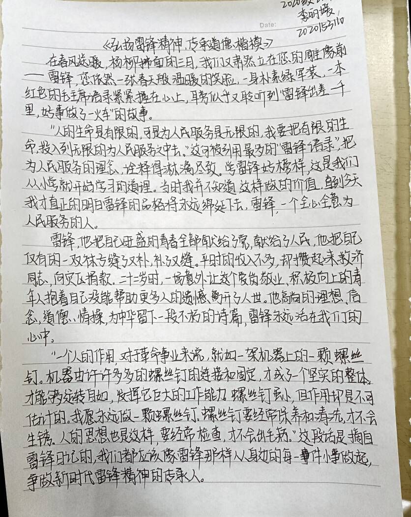 参赛选手用妙笔生出他们传承到的雷锋之花。在2019级财务管理专业闫雨莹笔下,雷锋精神是“赠人玫瑰,手留余香”的助人为乐。在2020级会计专业李丽媛的笔下,则是“人的生命是有限的,可是为人民服务是无限的,我要把有限的生命投入到无限的为人民服务中去”的无私奉献精神,是从身边小事做起的朴素。
