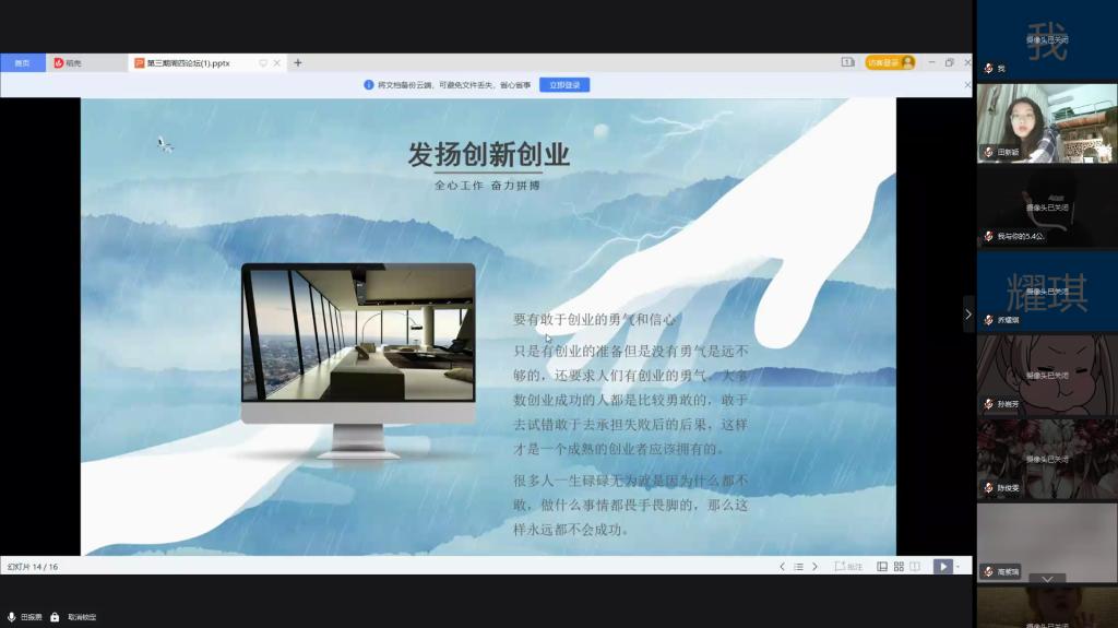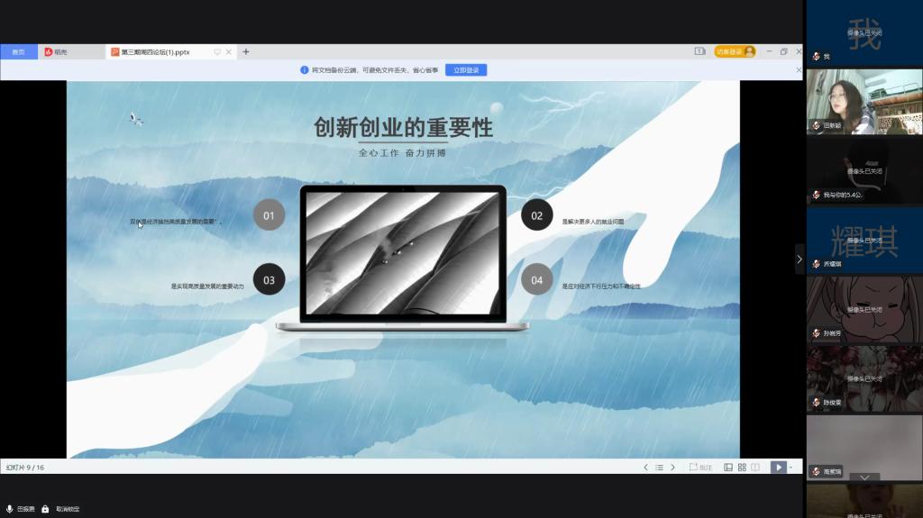为了解“双创”背景下的新特点和基本概况,提高政法学院学生创新创业能力,夯实创新创业的本领。2022年3月24日晚7点,政法学院北校区学生以线上形式举办了以“大众创业,万众创新”为主题的周四论坛活动,2021级劳动与社会保障专业全体同学参加本次活动。