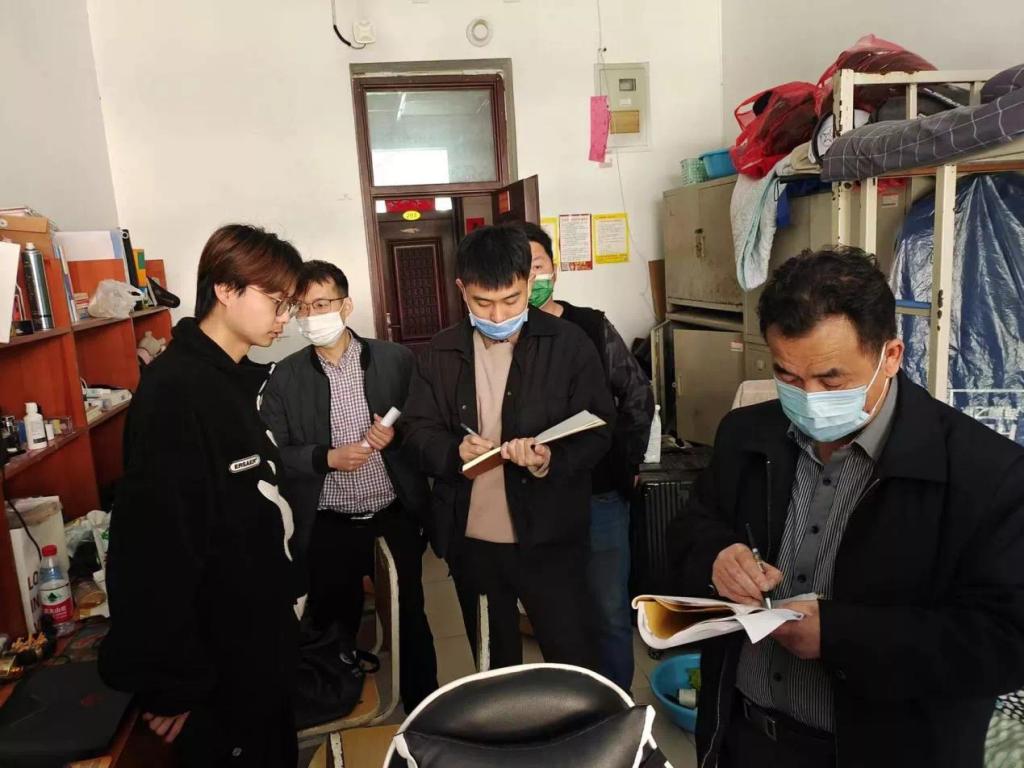 此次走访调研工作共分为四组同时进行,党委书记冯姝娅带队教科办主任曾娴、专职辅导员刘翔为第一组深入学生公寓15号楼宿舍;院长岳雷带队办公室主任李美丽、专职辅导员宋彦丽、马蕊为第二组深入学生公寓13号楼及住宅区宿舍检查工作;党委副书记王晓明带队专业教师刘得宏、郑子瑜,专职辅导员黄腾、冯兴玉为第三组深入学生公寓8号楼、10号楼、11号楼;副院长李梦华带队专业教师董颖婕、专职辅导员张华丹为第四组深入学生公寓5号楼、6号楼,全面细致的对学生疫情防控和线上学习工作进行指导。
