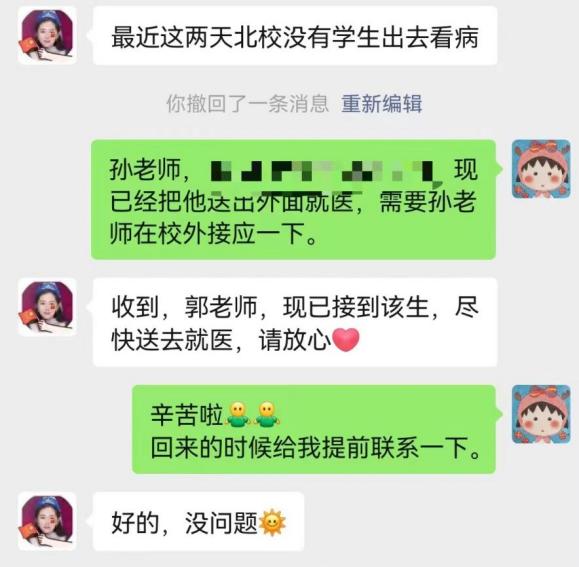 疫情防控形势下,我院教师建立内外联动机制。学生一旦有突发情况,需要校外就医,住校老师经保健科护送学生至保卫处,校外老师第一时间接应学生,亲自护送到医院,并进行全程陪护。