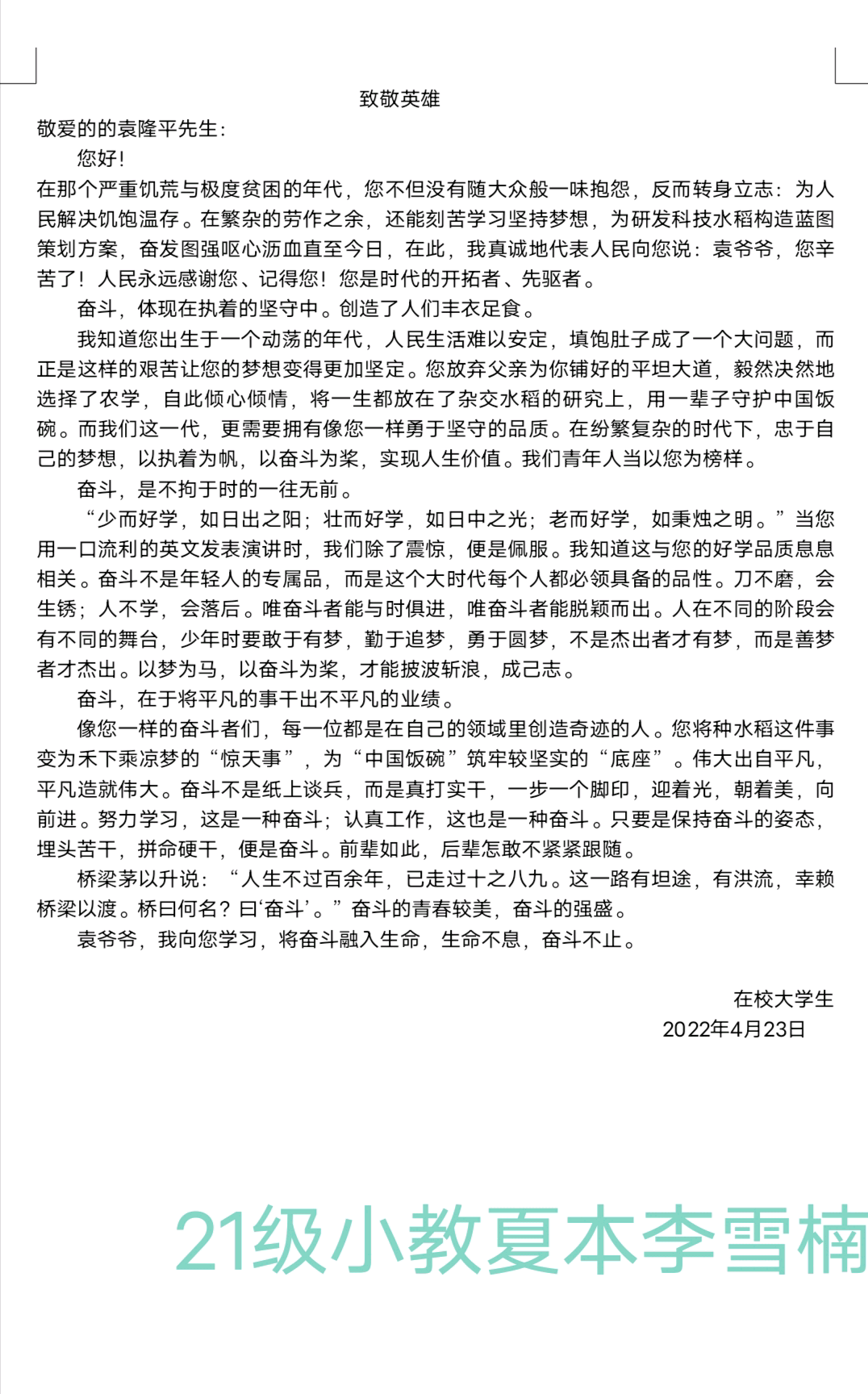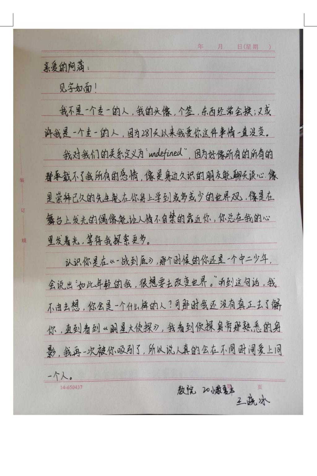 本次活动使同学们以书信的方式寄托对偶像的感情,学习偶像身上的正能量,追随心目中的光,为自己指明前进的方向。其中,2021级小学教育专升本二班丁晓飞在歌手张杰身上学到了对音乐的坚持,言明要向偶像学习,坚持自己的热爱。2021级学前教育3+4二班李雨倩的寄语歌颂了母亲的伟大,在信中述说成长故事,表达了母女间深厚的情谊,告诉我们要感恩母爱,回报母恩。
