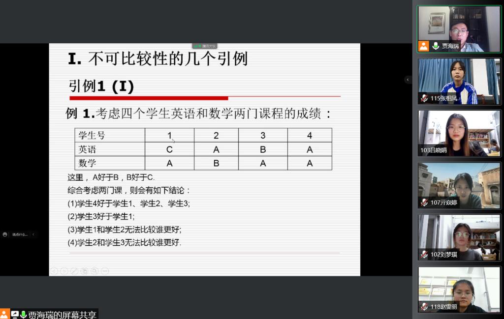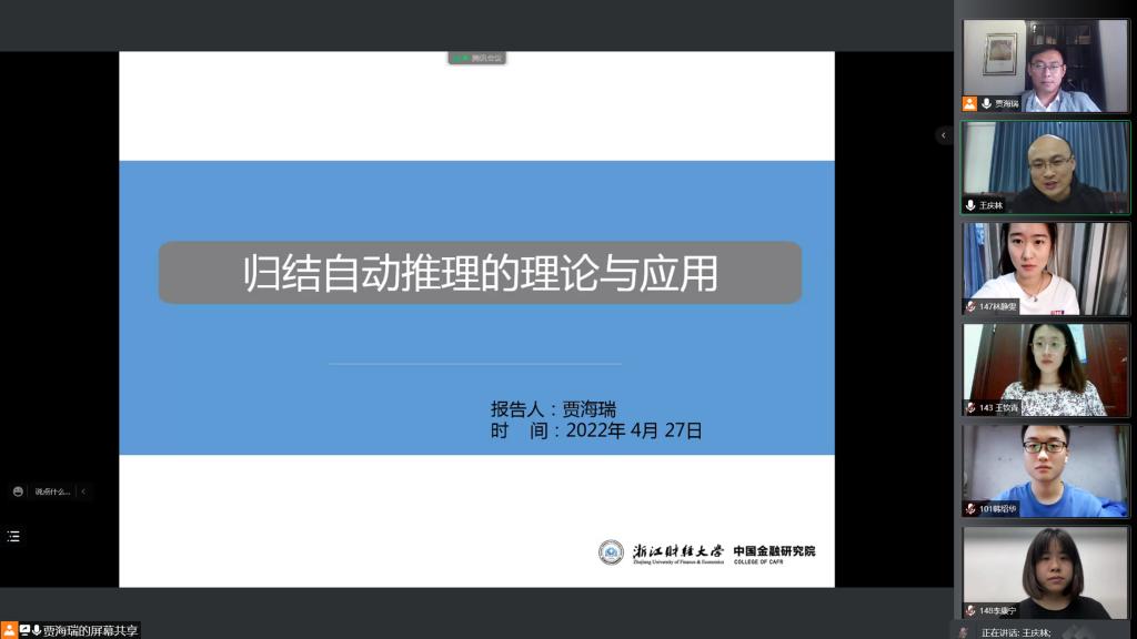 4月27日晚,浙江财经大学中国金融研究院基金研究中心副主任贾海瑞博士应邀做客数学与统计学院第34期“与信仰对话”讲坛,作题为“归结自动推理的理论与应用”的报告。本期讲坛由数学与统计学院党委副书记王庆林主持,信息与计算科学专业、统计学专业、数据科学与大数据技术专业等200余名学生线上聆听。