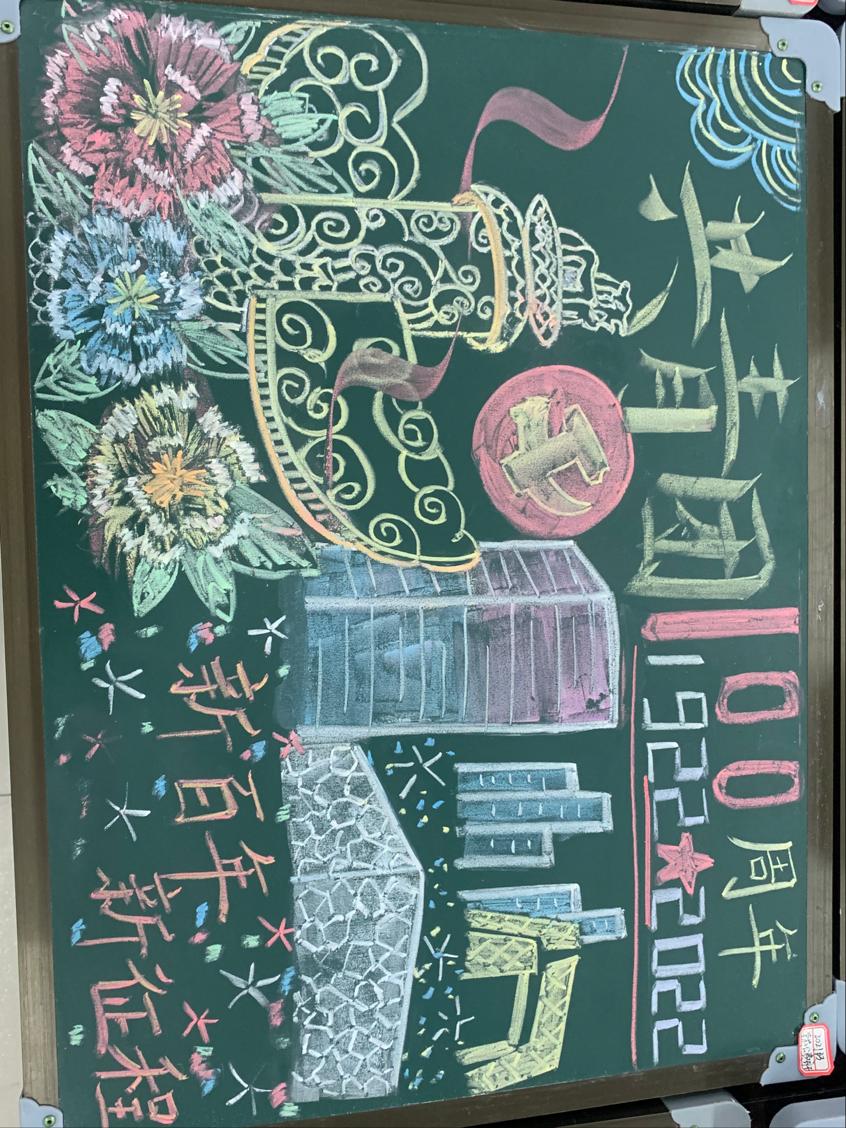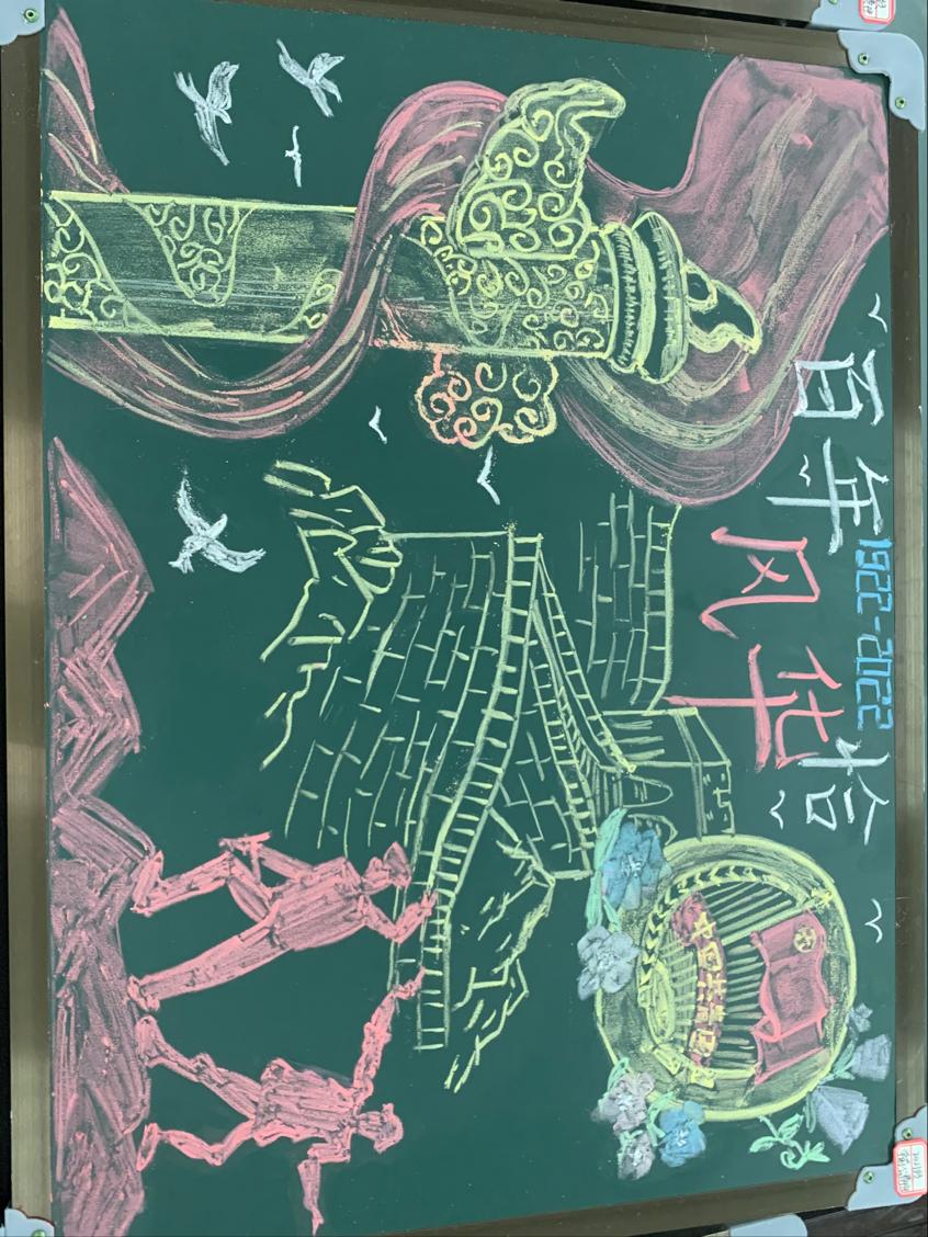 本次黑板画内容丰富多彩,书写清楚美观,整体版面分配得当,色彩搭配协调,产生良好的视觉效果。其中,教师教育学院团委的板报新颖独特,红色的团旗下两名朝气蓬勃的共青团员,象征着中国青年一代紧密围绕在中国共产党周围,焕发时代新光彩;2021级学前教育专业公费班团支部的板报图文并茂,色彩搭配协调,板报上的每一片祥云、每一朵花、甚至每一个文字等都富有浓浓的党团特色。