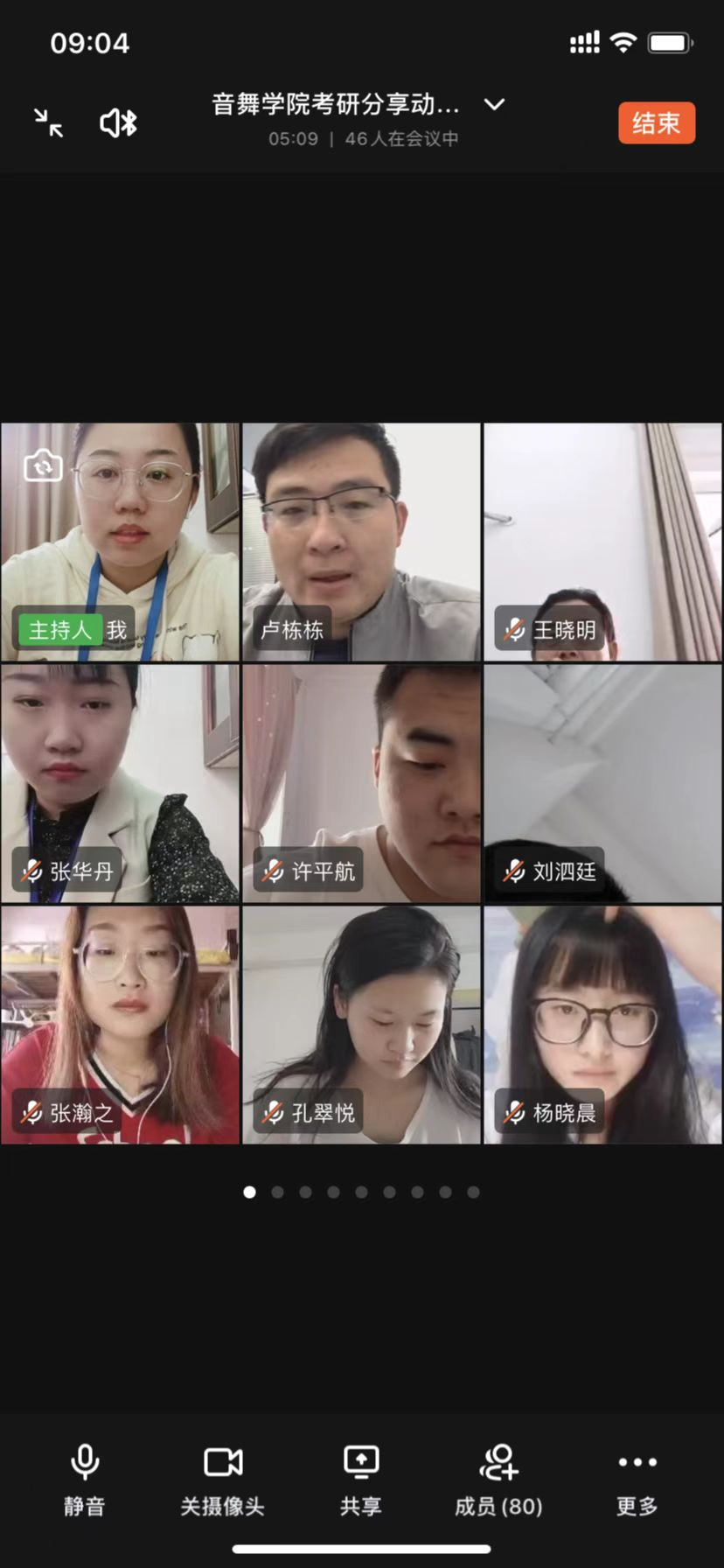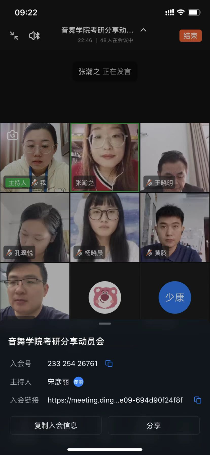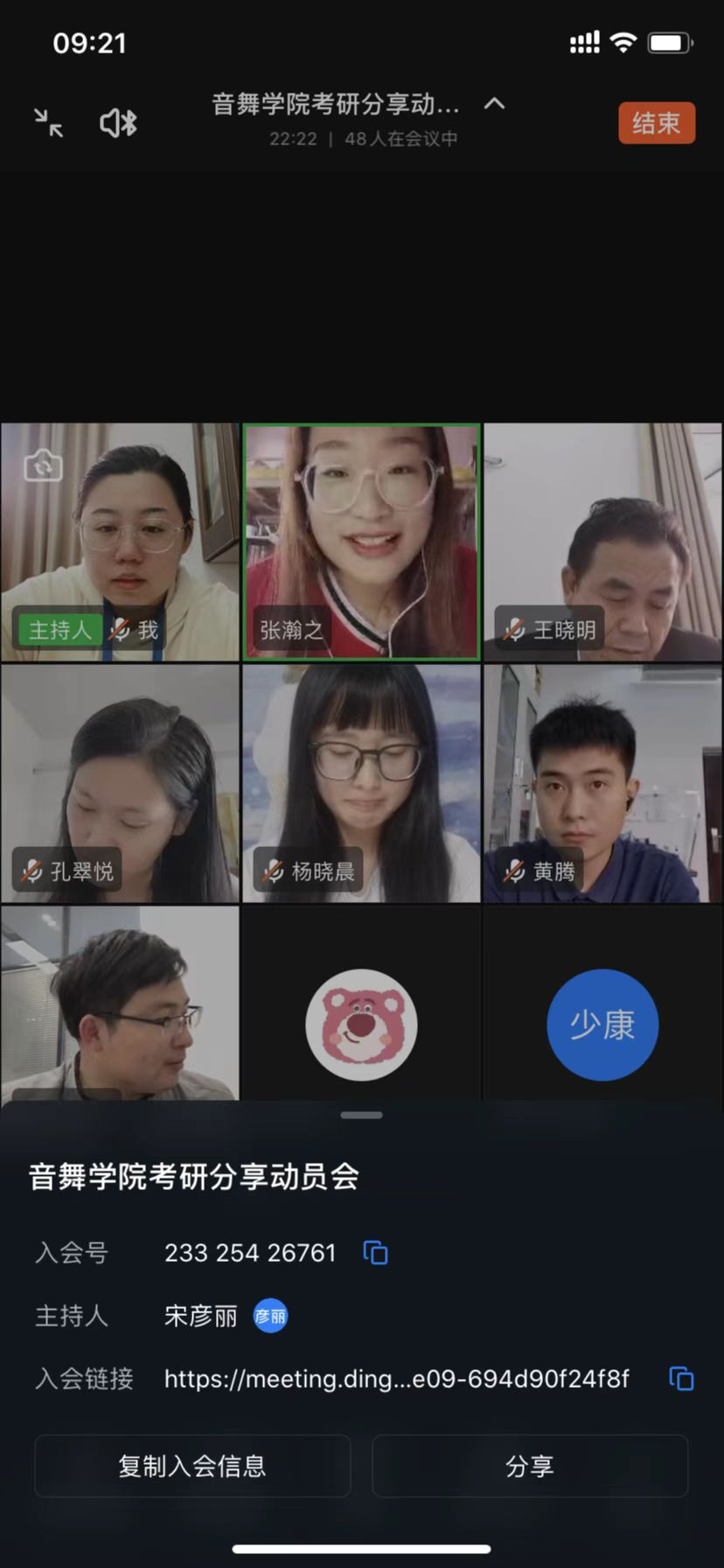 为鼓舞我院学子的考研士气,帮助我院考研学子,树立考研自信心,坚定考研信念,动员2019级的同学们积极备考2023年研究生考试,5月10日,音乐与舞蹈学院举办线上考研经验分享会和2023年研究生考试动员会。党委副书记王晓明主持本次会议,专业教师卢栋栋、专职辅导员宋彦丽、黄腾、张华丹及2019级计划参加2023年研究生考试的同学们共计80余人参加会议。本次会议邀请到我院8位考研成功“上岸”的2022届毕业生分享考研经验。