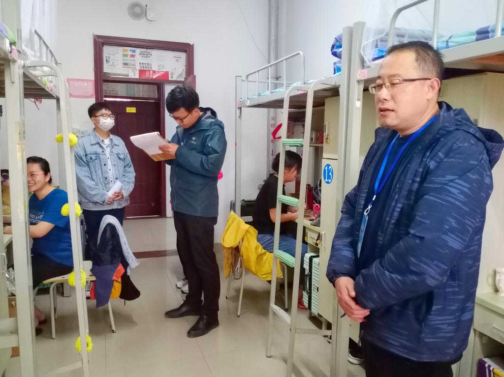 5月10日下午,必赢集团bwin学工办主任初汉平、全体辅导员以及班主任宋宪博深入14号学生宿舍进行走访。