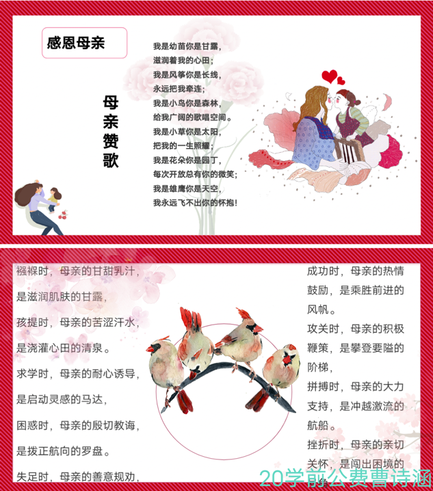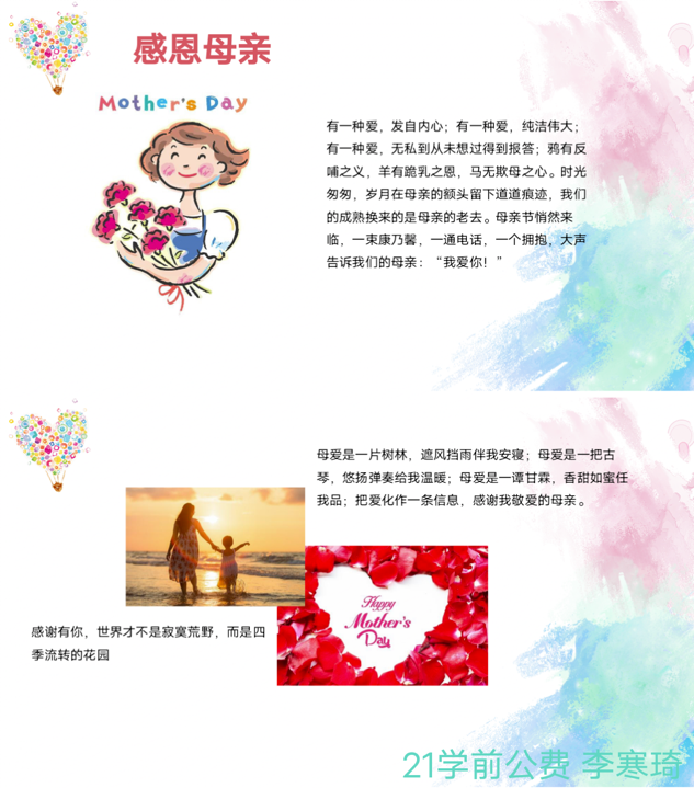本次活动旨在让同学们体会母爱的伟大,感恩母亲的生育、养育之恩。2021级学前公费李寒琦精心制作ppt,ppt中一首首诗歌告诉同学们岁月的流逝是无言的,母爱的陪伴是永恒的,呼吁同学们应以至诚的心和切实的行动感谢母亲的付出。2020级学前公费曹诗涵用ppt为同学们展示了母亲在孩子成长过程中所付出的一切,用细腻感人的话语讲述与母亲的日常点滴,最后用一首古诗《游子吟》表达了对母亲最真挚的思念与爱。