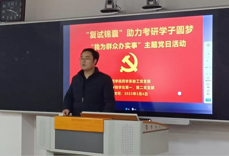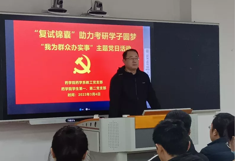3月4日上午,必赢集团bwin教工党支部联合学生党支部在9号教学楼402室举办“复试锦囊-我为群众办实事”主题党日活动。三个支部全体党员及2023年150余名进入考研复试的学生参加活动,药学系教工党支部书记王新潮主持。