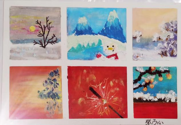 活动期间,同学们发挥想象,描绘出自己记忆中的冬日美景。其中,2022级学前教育专业3+4三班安子玉用鲜艳的色彩勾勒出一幅“凛冬落日图”,对比强烈,富有创意;2022级小学教育专业公费班张乃心作品主题鲜明,内涵丰富,以扎实的专业素养将银装素裹的冬景表现的淋漓尽致。