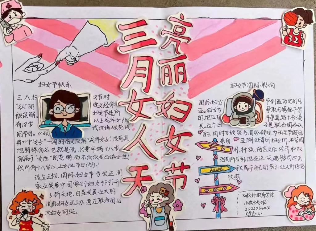 本次活动以手抄报绘制为主,结合创作解说的形式开展。参赛作品精彩纷呈,解说独具特色。其中,2022级学前教育专业对口本班的李胜瑶的作品画风优美简洁,设计独特新颖,朵朵绚丽的花表达了对广大女生的祝福与感恩;2022级小学教育专业公费班的张乃心以“三月女人天,亮丽妇女节”为主题,勉励各位女生都能够不忘初心,积极向上。