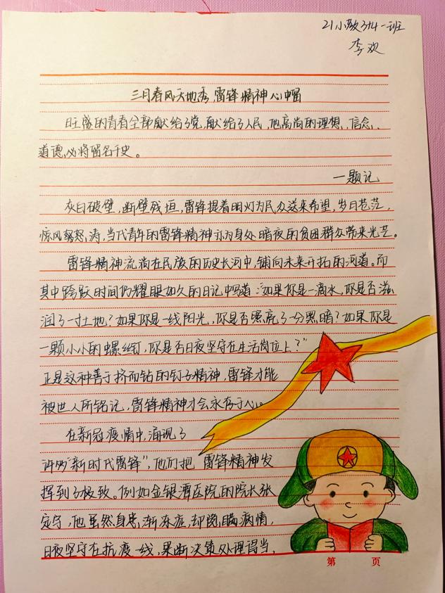 在征文比赛中,参赛选手以笔抒情,写出心中的雷锋榜样。其中,2021级小学教育专业3+4一班李欢以“三月春风天地秀,雷锋精神心中留”为主题,展现了各个城市的好人事迹,以及群众守望相助、崇德向善的故事,体现出雷锋精神的内涵;2022级学前教育专业3+4三班的高雨姗以精彩的文笔,描写奋斗在一线的各行各业中涌现的先进模范、道德楷模,热情讴歌雷锋精神,呼吁同学们致敬典范,学习高尚品德。