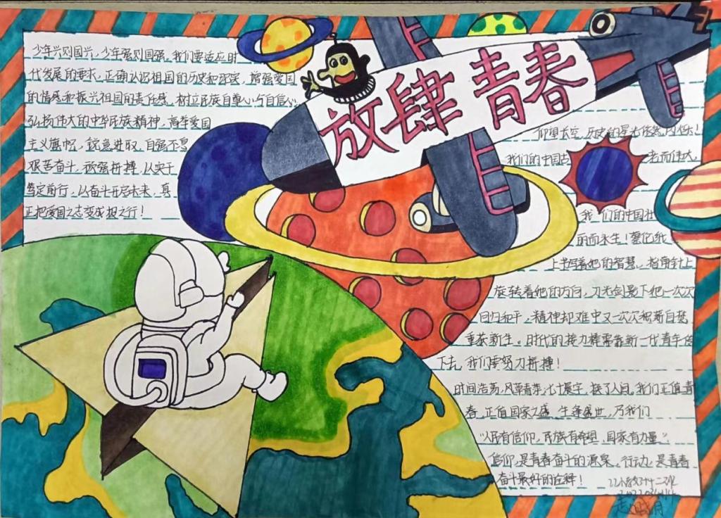 本次活动,参赛者围绕青春进行创作,作品内容丰富,形式多彩。其中,2022级学前教育专业3+4三班侯倩倩围绕“杨帆启航,逐梦成长”,呼吁同学们珍惜青春、继续奋斗,将青春的魅力尽情释放;2022级小学教育专业3+4二班赵晓月的作品色彩鲜明,以“放肆青春”的主题激励同学们要“以实干笃定前行,以奋斗开启未来”。