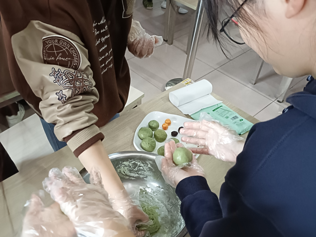 清明节吃青团,寓意着团圆,也寄托着对故人的怀念之情。社团成员提前准备好青团预拌粉、豆沙、鸭蛋黄等材料,学生自行分组制作青团。参赛学生捻青、加粉、和面、做馅,分工合作,认真制作,一个个青团就此成型。包好的青团在餐厅后厨蒸熟,小组成员进行品尝。参赛学生在制作青团的过程中体验劳动的快乐,了解中国传统节日民俗。评委根据每人青团的数量、外形和口味进行评选。最终评出一等奖、二等奖、三等奖。