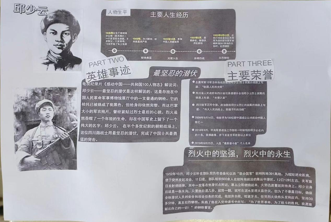 本次活动采用图文结合的方式,参赛选手的作品内容充实且富有创意。其中,2021级学前教育3+4二班白一冉讲述了革命先烈邱少云的英雄事迹,向同学们介绍了影响和鼓舞一代又一代人民的“邱少云精神”,呼吁同学们传承绝对忠诚、严守纪律、顾全大局、勇于担当的革命精神;2021级学前教育专业3+4一班牟书逸通过介绍人民英雄黄继光的主要经历与革命精神,表达了对英雄烈士的缅怀和追思,人民英雄无私奉献、英勇顽强的精神和人生价值追求激励着同学们不断前进。