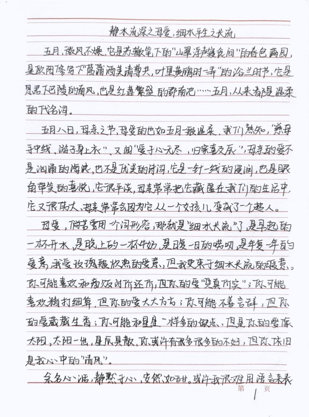 本次活动,参赛者以笔抒情,从不同角度诠释了对伟大母亲的感恩之情。其中,2022级小学教育专业公费班郑雨秦通过分享自己与母亲的之间的故事,用真挚的语言表现自己的心声,表达了对母亲的感激之情;2022级小学教育专业公费班张乃心通过多种感恩实例诠释了中华民族自古以来就有的感恩的传统美德,展现着感恩文化滋养着世世代代的炎黄子孙。