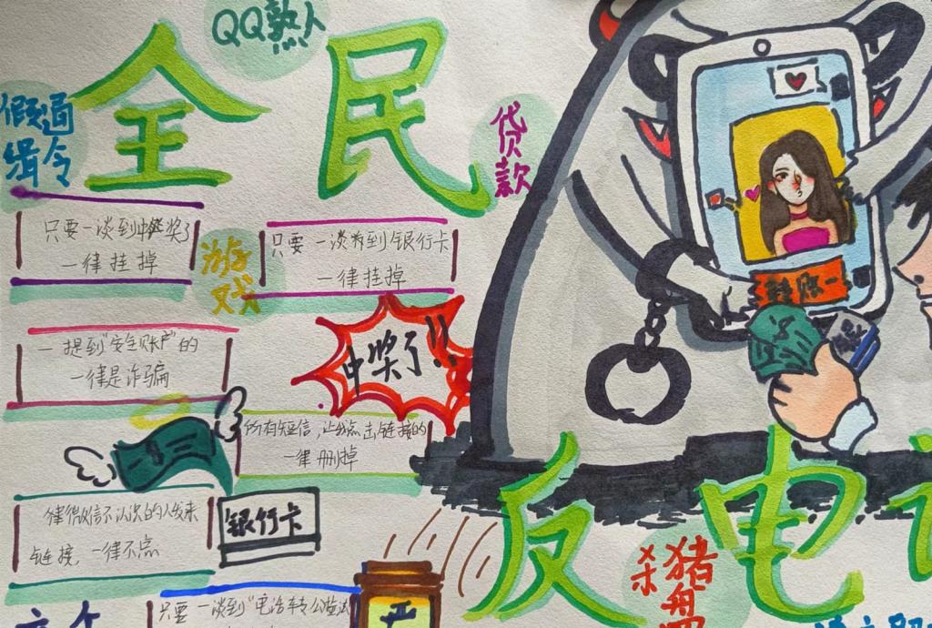 本次活动以手抄报绘制为主,作品内容丰富,构图形式多样。其中,2022级学前教育专业3+4一班杨晨以“全民反电诈”为主题,用独特新颖的设计展现了诈骗的各种手段,充分表达出电信诈骗的危害;2022级学前教育专业3+4一班李深怡的作品主题鲜明,用精美独特的画风呼吁同学们要提高防范意识,警惕校园诈骗。