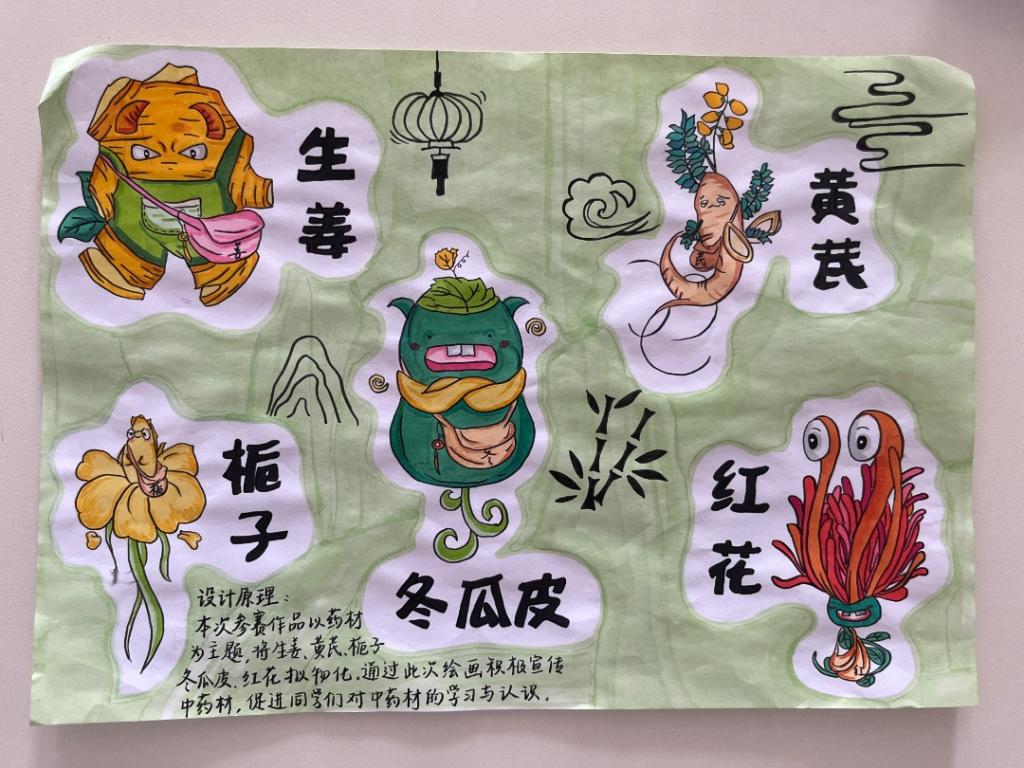 活动要求同学们将中药材与小动物相结合,赋予药材以动物的生机,创作出中药材拟物画。同学们通过广泛搜集各类药材资料,发挥想象力,将中药材与小动物融合,赋予各种中药鲜活的形象,绘制于图纸上,并在一旁附上文字,说明了自己的创作理念和设计原理。同学们精心设计制作的药材精灵画,不仅将小动物的神态体现地淋漓尽致,还保留了中药材原有的特征,既科普了中药材知识,又让中药材焕发出了不一样的生命力。