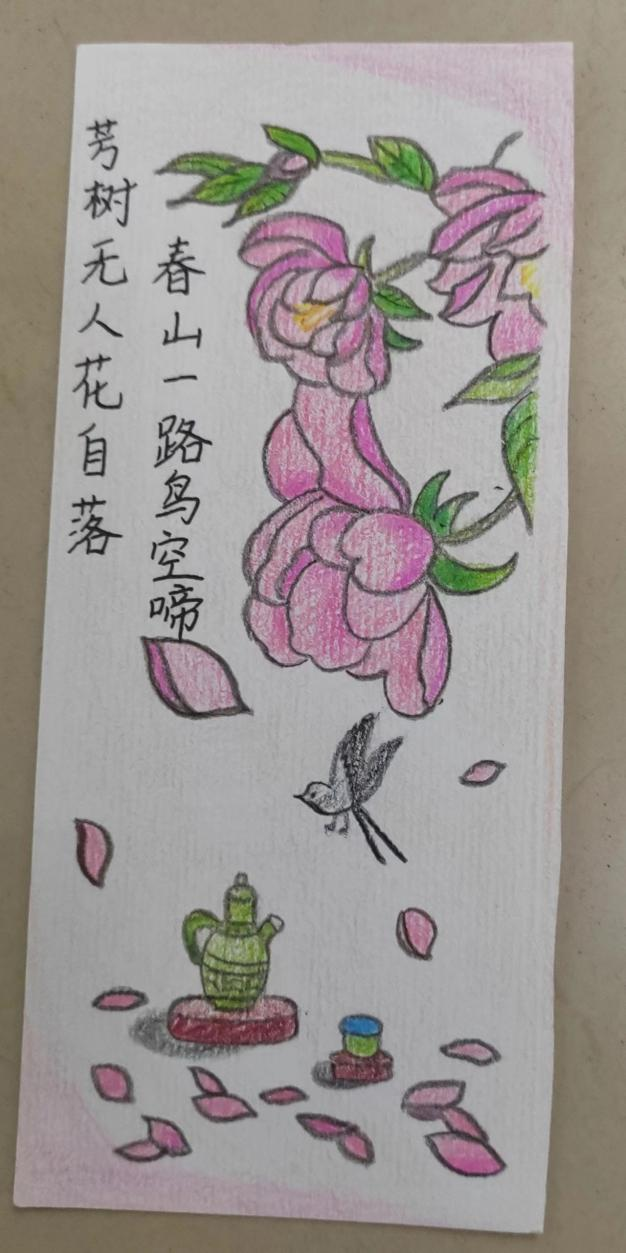 本次比赛以手工制作为主,将花作为书签的主体形象,内容丰富,多彩多样。其中,2021级学前教育专业3+4二班白一冉以优美的笔触勾勒出花下独自饮酒的画面,飘落的花瓣,配上优美的诗句,体现花之美;2022级学前教育专业3+4三班匡原欣用油画棒画出两簇郁金香,色彩鲜艳,表现出花朵的绚丽与盛放。