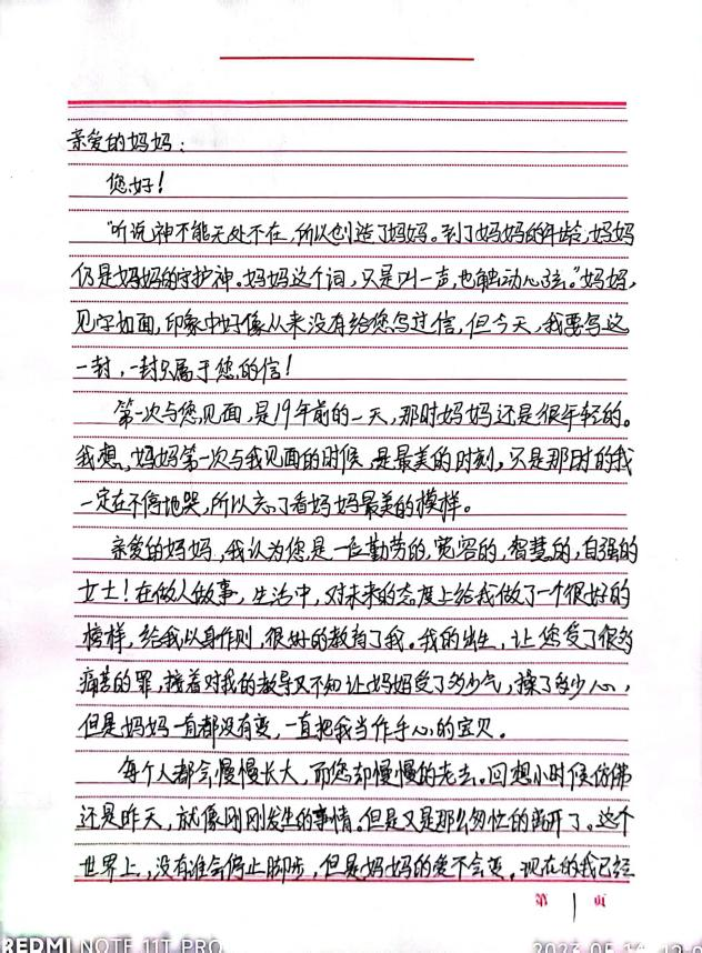 在本次活动中,选手运用细腻的文字语言,生动地勾勒出对母亲的感激之情。其中,2021级小学教育专业3+4二班的张梦婕以“百善孝为先”为题,通过道出古语中的孝悌,生动形象的表达出母爱的伟大无私;2022级学前教育专业3+4四班的孔敏以书信的形式,道出母爱的默默无闻,展现了自己对母亲真挚的爱。