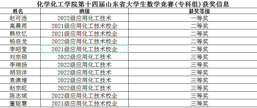 近日,第十四届山东省大学生数学竞赛(专科组)成绩公布。化学化工学院2022级应用化工技术班赵可浩同学荣获一等奖,李昭莹等四名同学获得二等奖,袁澳增等七名同学获得三等奖。
