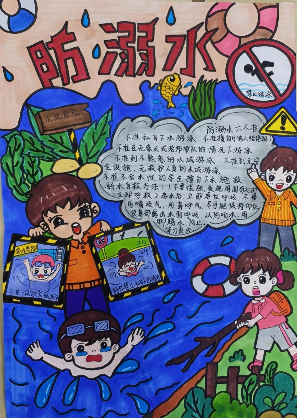 本次活动参赛选手们从多角度展现了防溺水的重要性,作品形式多种多样、别具一格。其中,2021级学前教育3+4专业二班白一冉的作品运用丰富的色彩生动形象的刻画出游泳时不慎溺水的危险场景,提醒同学们不要在深水区游泳以及禁止野外私自下河游泳;2022级学前教育3+4专业三班匡原欣的作品把文字与图画相结合,绘声绘色地表达出遇到溺水的情况时保持冷静是十分重要的。