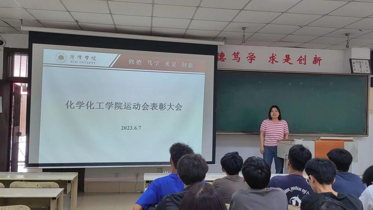 为进一步激发化学化工学院学生参与体育运动的热情,增强学生集体荣誉感,6月7日,化学化工学院于九号教学楼102教室召开2023年运动会表彰大会。化学化工学院学工办主任(团委书记)王庆美携院系全体运动员参加此次大会。