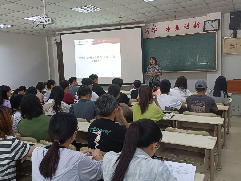 为进一步激发化学化工学院学生的考研热情,加强化学化工学院学生对考研的了解,明确自己的择校方向,找到适合自己的学习方法,6月8日,化学化工学院在9号楼104教室召考研经验交流会。化学化工学院副院长李风海、学工办主任(团委书记)王庆美及化学化工学院2020级本科生、2022级专升本班同学参加本次交流会。