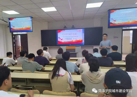 为进一步加强学习贯彻习近平新时代中国特色社会主义思想,深化主题学习教育,城市建设学院于6月20日在9号教学楼412室开展了“品读红色经典,擘画光明未来”的主题党日活动,城市建设学院党委副书记刁永鸽,学生第二党支部书记汤洪震,辅导员李伟、刘兴飞,教师张世富、邵珠海出席本次活动,城市建设学院学生第一、第二党支部全体党员同志参加此次学习。