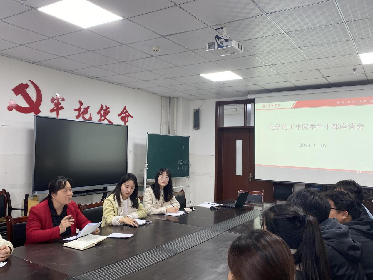 为充分提高学生干部素养,加强对学生干部培养,11月7日,化学化工学院于综合实验楼E224召开学生干部座谈会,化学化工学院党委书记王化荣,辅导员田涛及部分学生干部参与此次会议。